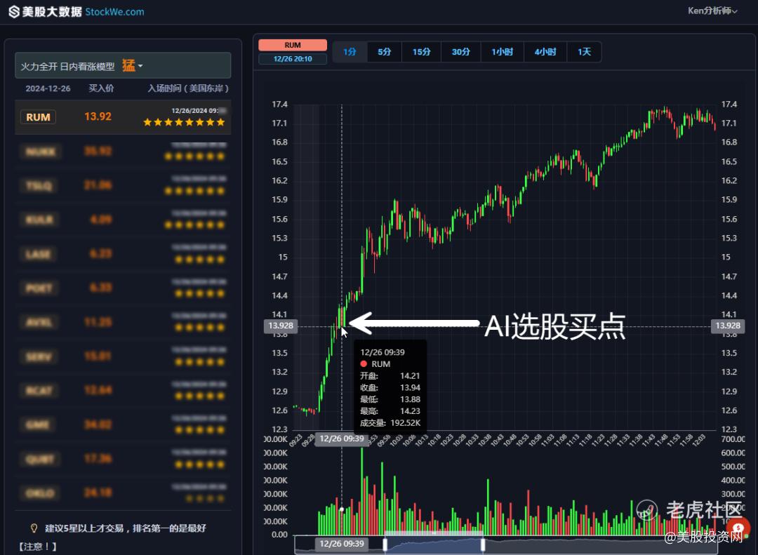 此外,美股大数据 今天 AI选股选出来 RUM,13.9进场,一路飙升到17.4美元,涨幅 25%