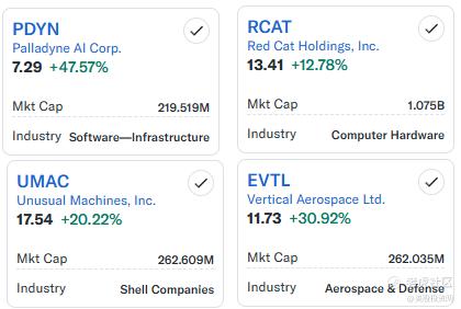美股无人机概念股也集体大涨,PDYN涨超57%,UMAC涨超20%,EVTL涨超30%。RCAT涨超15%