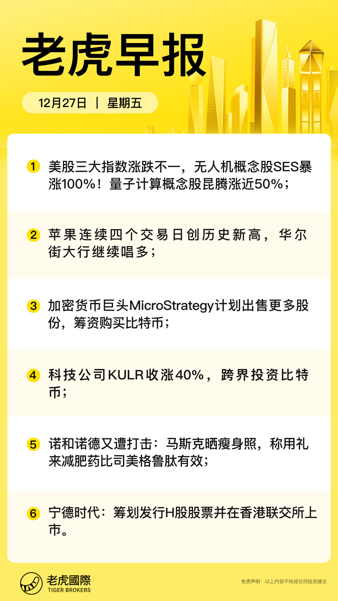 美股收盘 | 三大指数涨跌不一,无人机概念股SES暴涨100%;量子计算概念股昆腾涨近50%