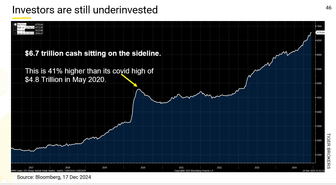 首先,场外资金。目前还有6.7万亿美元在货币市场基金(MMF)中。这比COVID-19疫情高点高出约41%。