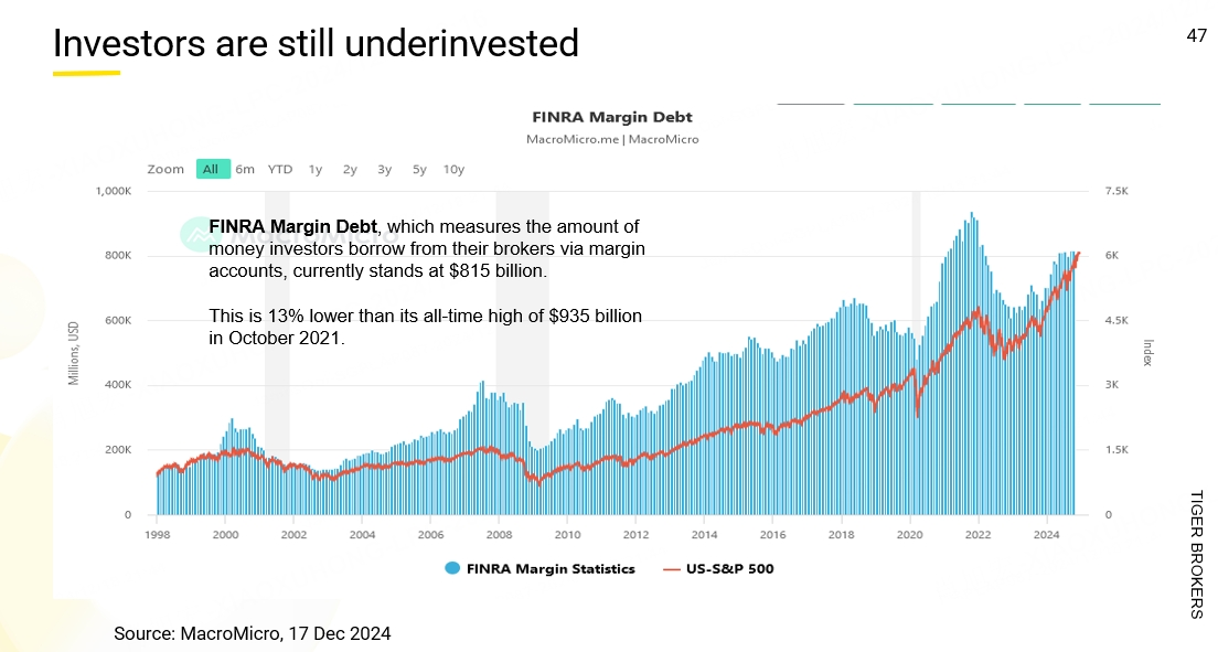 其次,FINRA保证金债务。FINRA保证金债务是投资者从保证金账户中借款的金额,目前为8150亿美元,比其历史最高点低约13%。这表明投资者可能还没有借够。