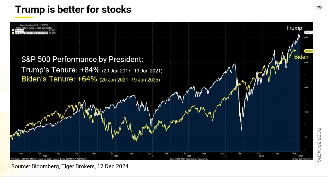 最后,特朗普利好股市。在特朗普1.0时期,尽管有COVID19和贸易战, $标普500(.SPX)$ 仍然上涨了84%。
