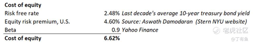 内在价值计算从计算折现率开始,即股权成本。我使用股权成本而不是 WACC 有两个原因。首先,微软 970 亿美元的总债务仅占该公司市值的 3%。其次,我使用杠杆 FCF 作为 DCF 的核心盈利系数,DCF 代表偿还债务后股东可获得的现金流。
