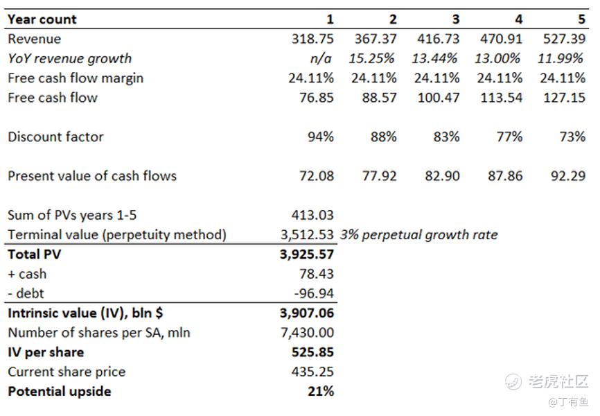 微软的股权成本为 6.62%,考虑到该股票的贝塔系数相当低,这个数字看起来很合理。从普遍预期来看,收入增长速度会随着时间的推移而放缓,这看起来像是用于 DCF 模型的现实轨迹。第一年的 FCF 利润率为24.11%,这是一个杠杆率。TTM 水平非常接近过去五年的平均水平,这意味着对于微软这样规模的公司来说,大幅扩大其 FCF 利润率是相当具有挑战性的。因此,我将 DCF 的第 2-5 年保持不变。永久增长率保守地定为 3%。