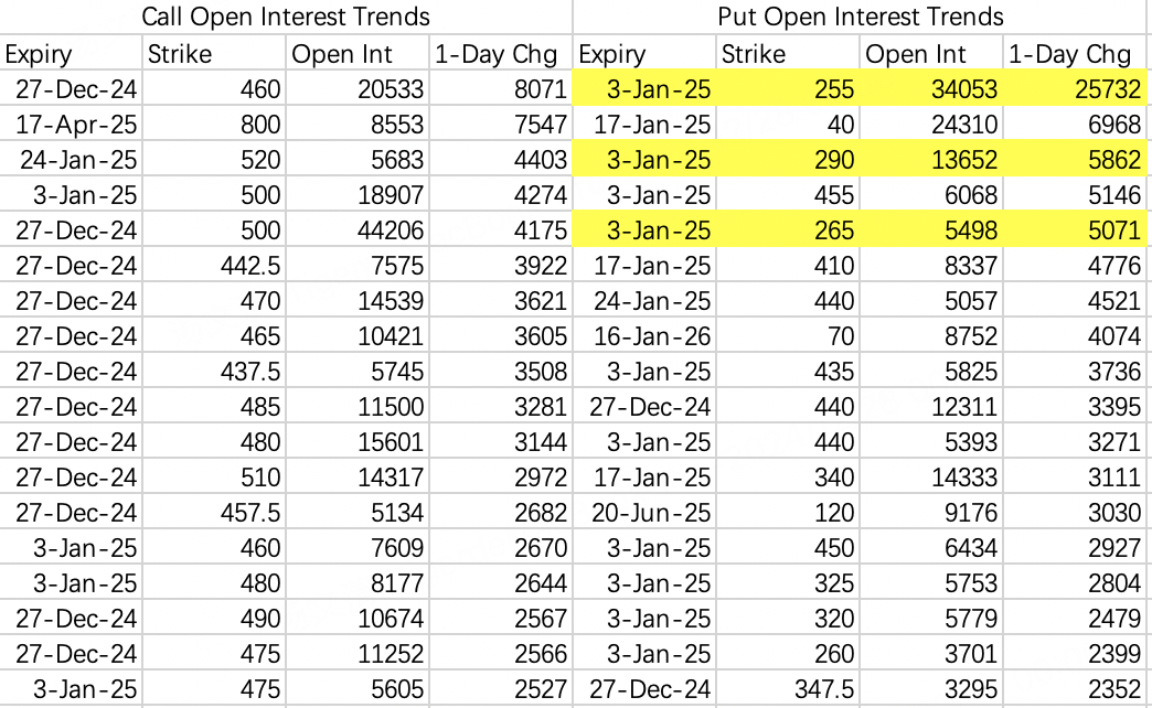 3、分别对应SPY做空大单 $SPY 20250321 565.0 PUT$ ,特斯拉看涨大单跑路 $TSLA 20250221 380.0 CALL$ ,英伟达看涨大单下调行权价roll仓 $NVDA 20250221 125.0 CALL$ 。