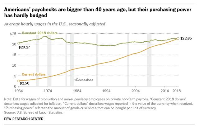 另一方面,非管理私营部门工人的实际平均小时工资与1978年的通货膨胀因素大致相同。40年来,大量的美国工人几乎没有获得额外的购买力。