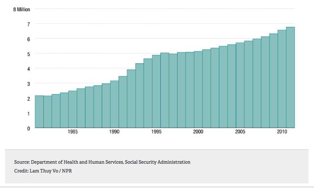1930年,男性的不活动率(既不工作也不找工作)低于2%。1970年升至4%,然后在2016年爆发至11.5%。只有3%的人是"沮丧的工人" - 那些辍学的人由于对就业市场的沮丧而退出。从1968年到2014年,这个群体的不活动增长不到10%。为什么陡峭上升呢?罪魁祸首似乎是残疾索赔的增加: