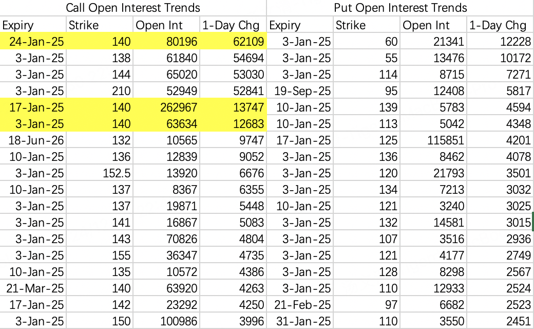 周五开盘下跌时,有人开仓6.2万手1月24日到期的140call $NVDA 20250124 140.0 CALL$ ,搏小反弹。