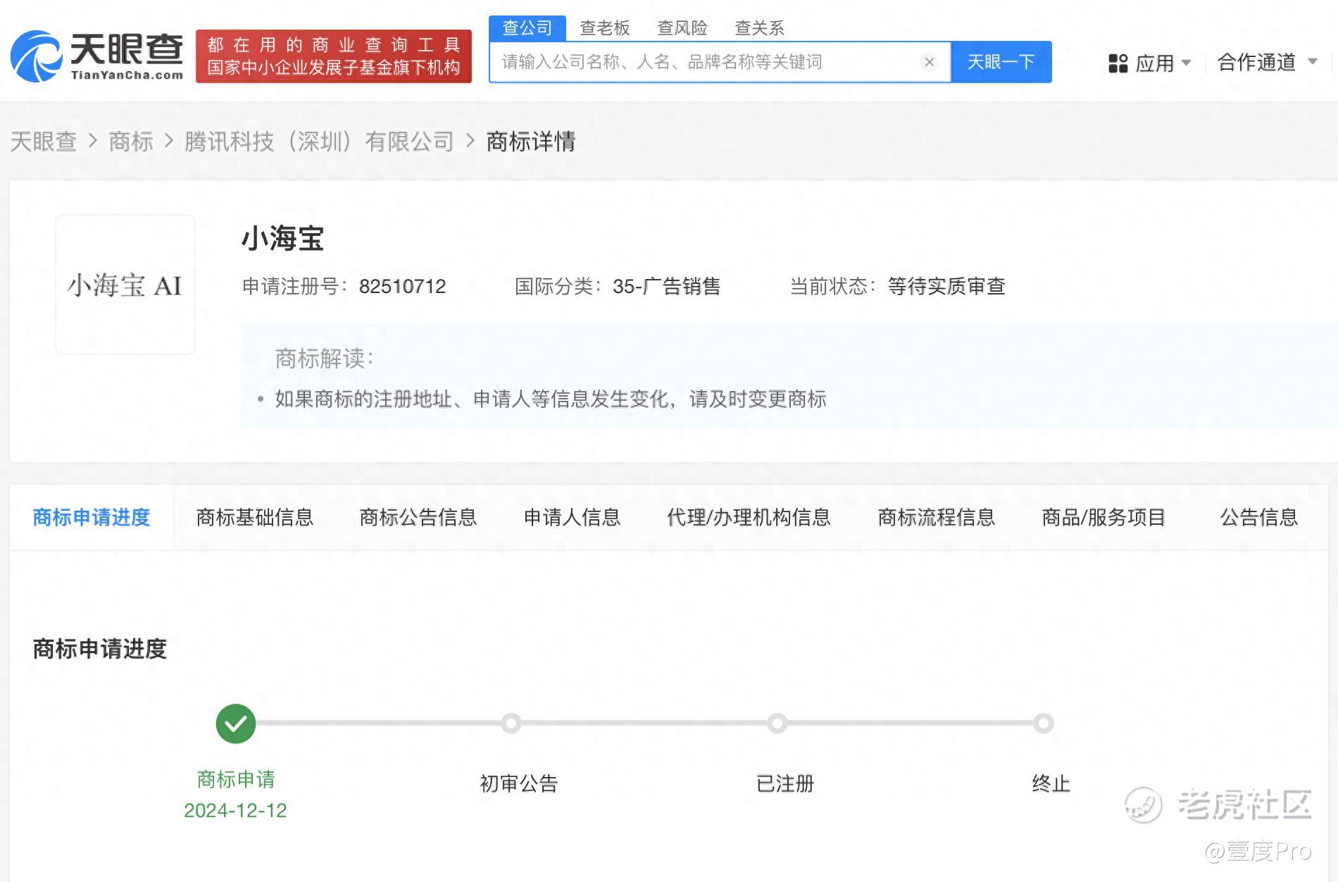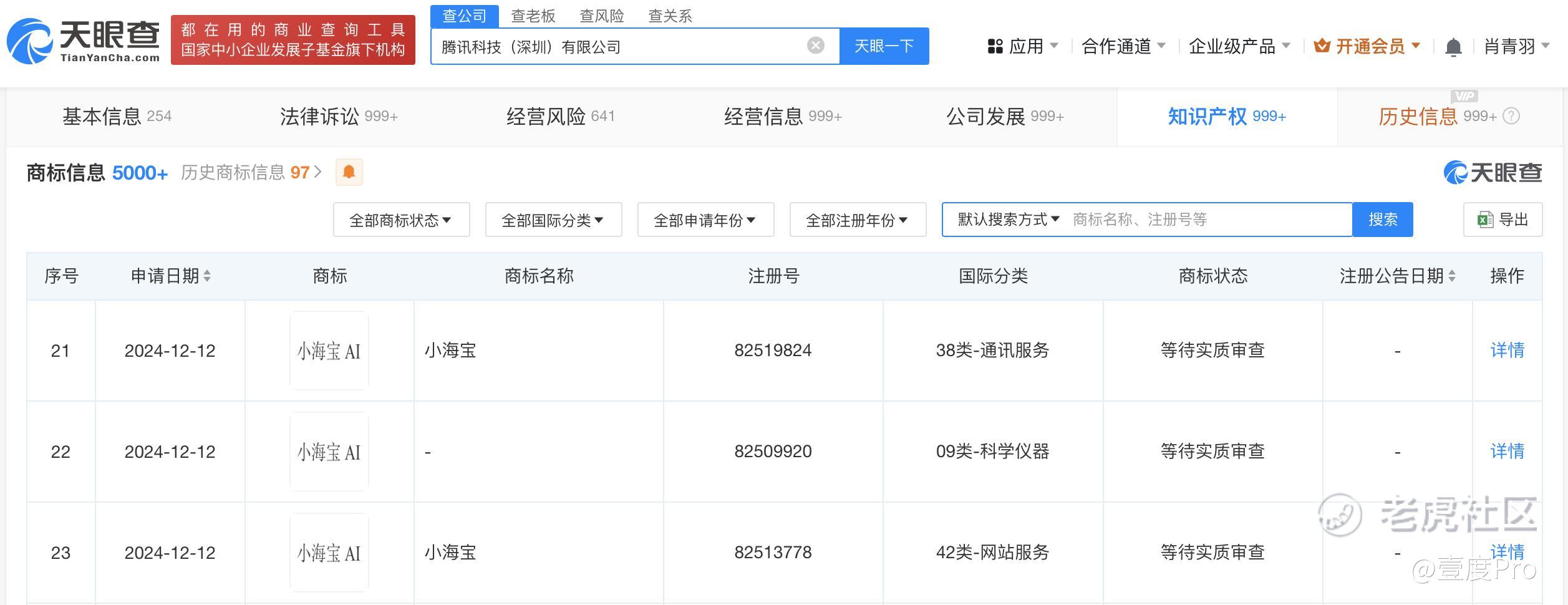 天眼查知识产权信息显示,近日,腾讯科技(深圳)有限公司申请注册多枚“小海宝AI”商标,国际分类为通讯服务、科学仪器等,当前商标状态均为等待实质审查。