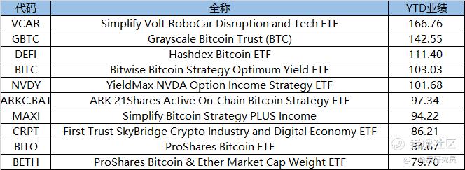十强整理在下面这张表格里了:截至12月30日,在非杠杆化ETF中,今年表现前10名的ETF,几乎被比特币和加密货币主题ETF包揽。