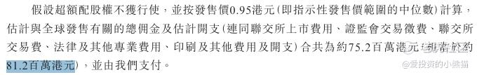 然后这个票招股书上按发售价的中位数0.95港元计算,公开的上市所有开支总额约为8120万港元,募资额约2.38亿港元,占比约34.12%,开支相比募资额算是比较多了。