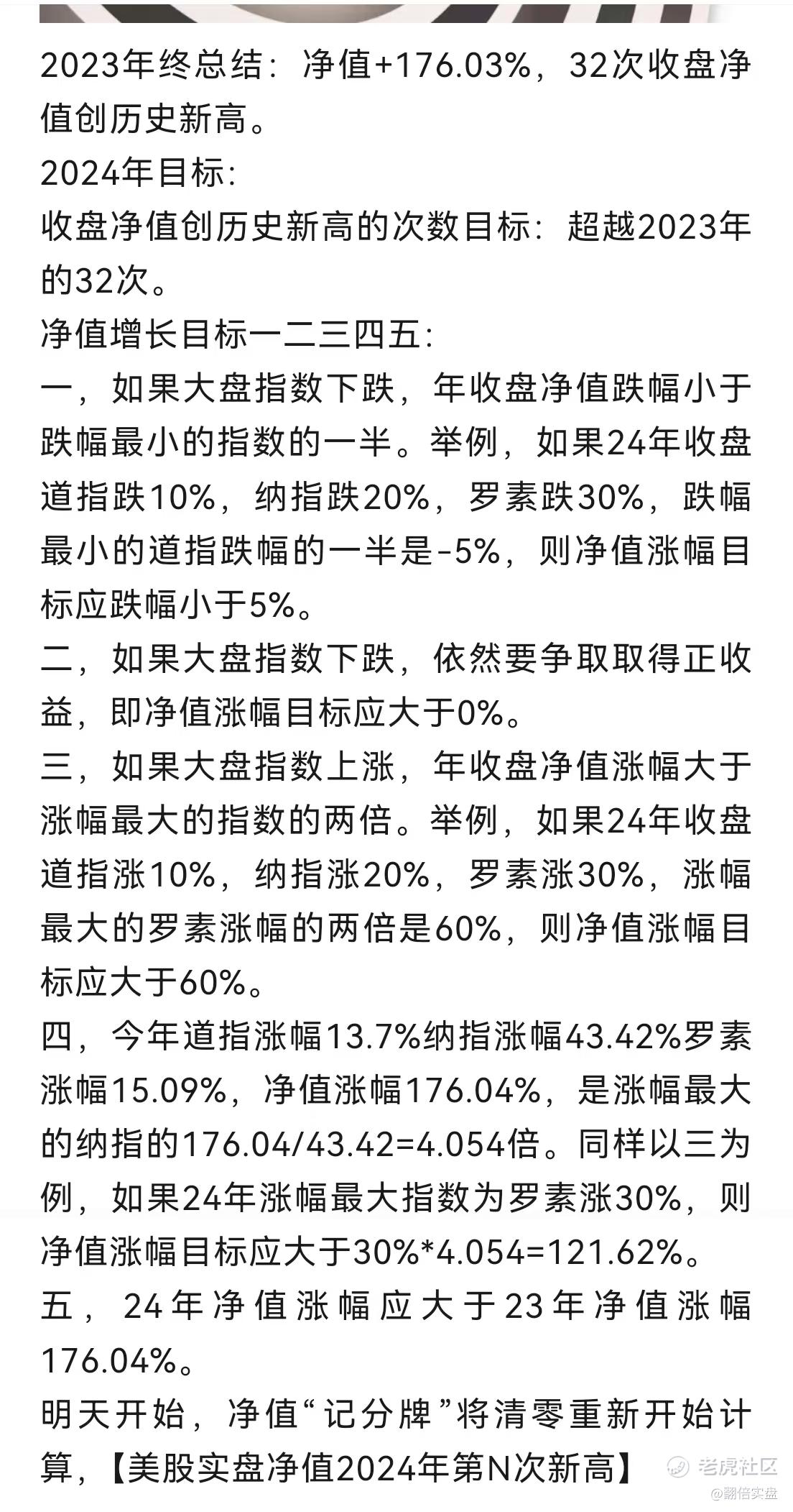三,如果大盘指数上涨,年收盘净值涨幅大于涨幅最大的指数的两倍。举例,如果25年收盘道指涨10%,纳指涨20%,标普涨15%,罗素涨30%,涨幅最大的罗素涨幅的两倍是60%,则净值涨幅目标应大于60%。