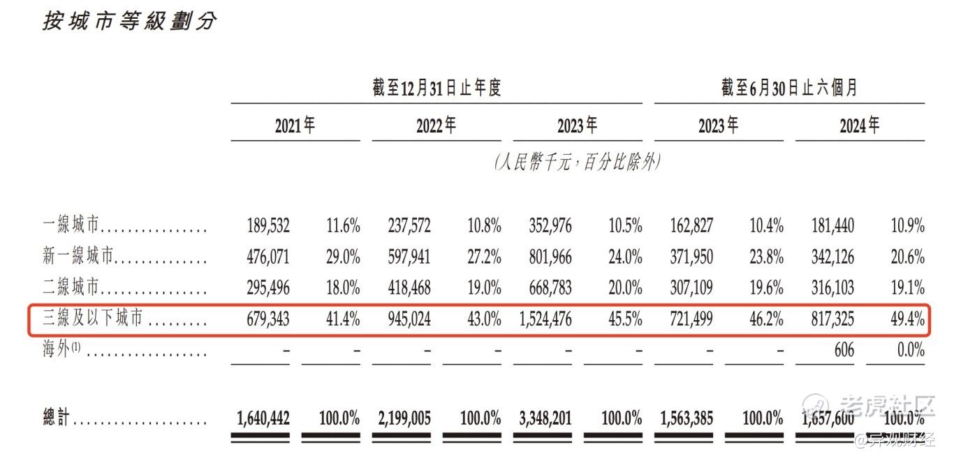 目前,三线及以下城市为沪上阿姨贡献的收入占比在逐步提升,截至2024年6月30日,沪上阿姨三线及以下城市的收入达到8.2亿元,收入占比高达49.4%。