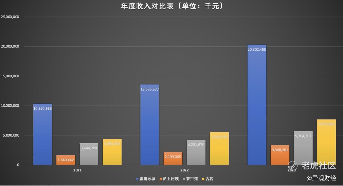 最后对比看看茶百道、古茗、沪上阿姨、蜜雪冰城的业绩表现。