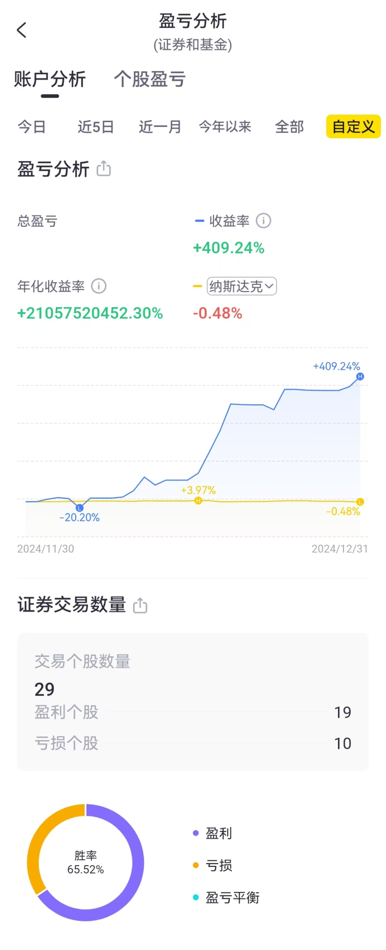 我发现对于交易来说,只要有波动就有赚钱的机会,无论行业和趋势是涨还是跌。就像24年12月 $纳斯达克(.IXIC)$指数 -0.48%,而我单月账户盈利+410%(数据均来自TigerAPP,但好像计算上有差异)。Whatever,我想表明的是,交易是可以脱胎于大的市场背景,而在微观中捕捉局部细小机会的。做交易让我的格局打开很多,市场永远会给你机会,只要美股的成交量不出现断崖式下跌,那机会永远存在!
