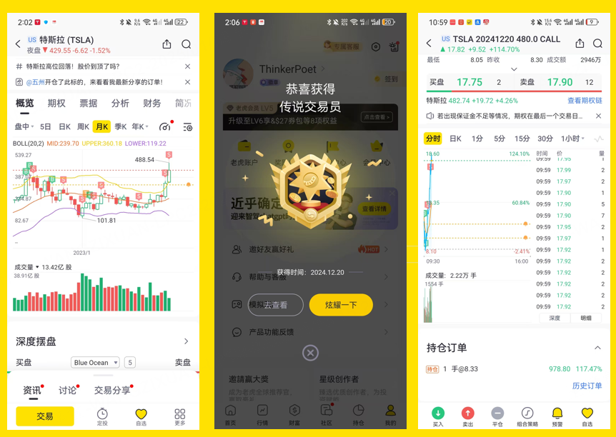 对于美股的投资年限至今有三年多,而个人投资心态和交易风格成长最大的一年是24年。2021年我买了 $特斯拉(TSLA)$ 的汽车,当时很迷恋马斯克,很看好这家公司想购买股票参与他的梦想,正好碰上老虎证券的在线开户活动,所以拥有了这个账户。