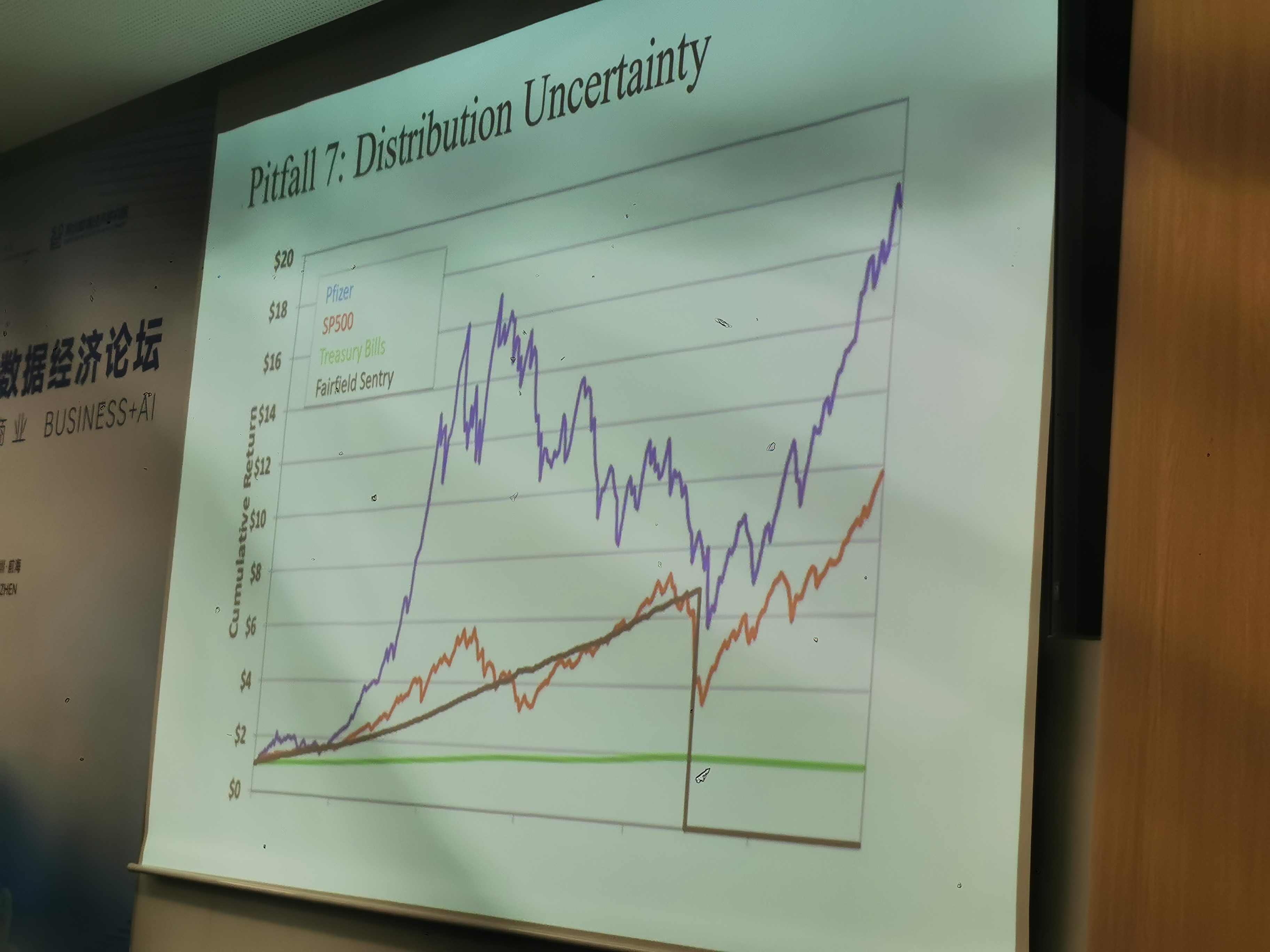 在场呼声最高的是选褐线的。而当主讲教授公布所有曲线随时间推移的后半段后,选褐线的人大惊失色,该线断崖式归零(这根线代表的是一个采用庞氏骗局的基金),而在我内心默默选择的看似最不理智的蓝线,最后触底反弹表现最佳(代表 $辉瑞(PFE)$ 股票),其次是红线(代表美国 $标普500ETF(SPY)$ ),最稳定的是绿线(代表美国国库券)。