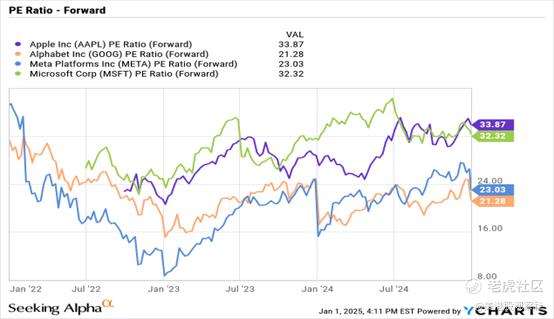 这里的问题是,苹果的交易价格是25财年EPS目标的34倍。苹果现在比其他科技巨头更贵,所有这些都预计增长10%以上,通常增长率是苹果的两倍。微软尽管直接投资于OpenAI,但价格稍便宜,谷歌和Meta Platforms都已经将AI整合到他们的平台中,以推动更高的使用率和更多的广告收入。