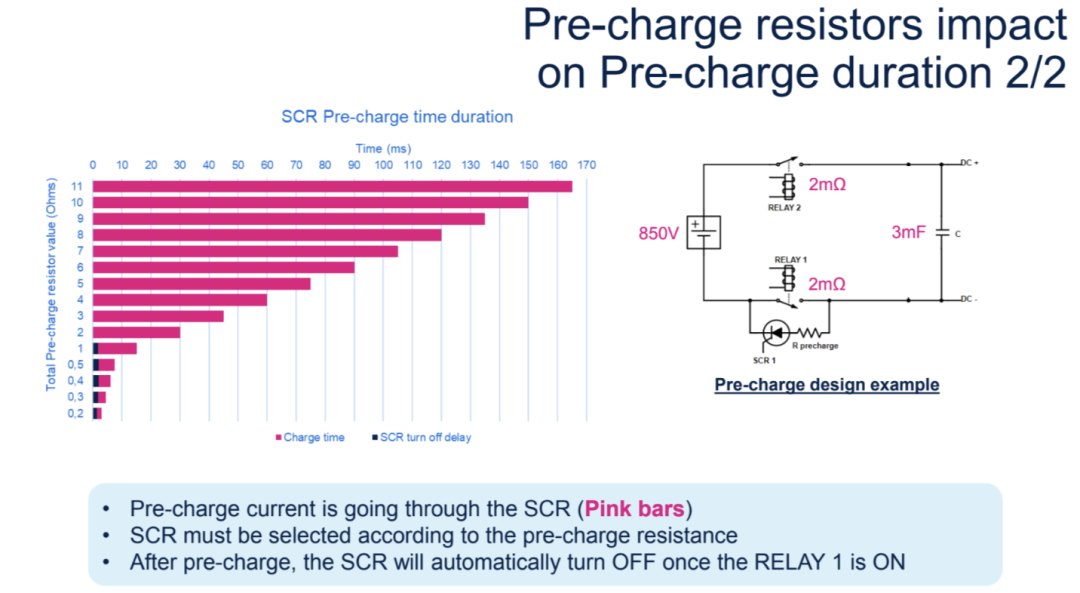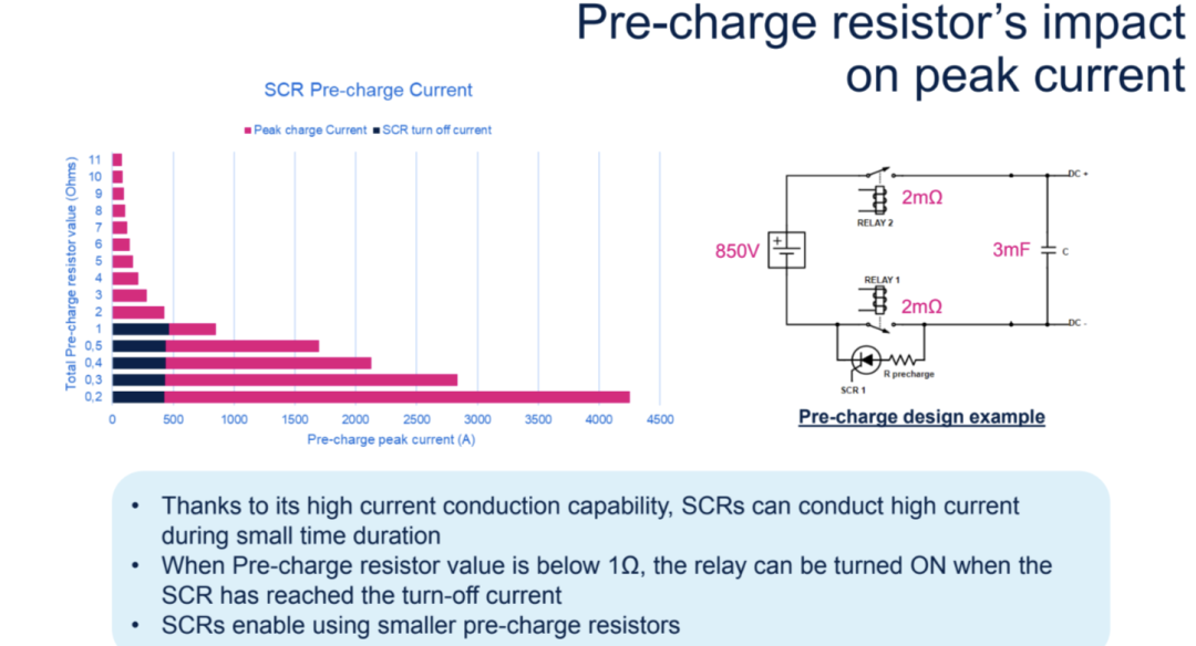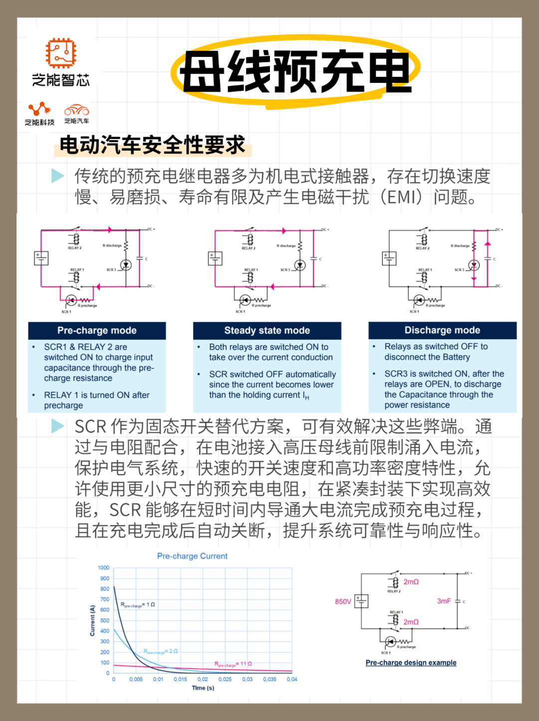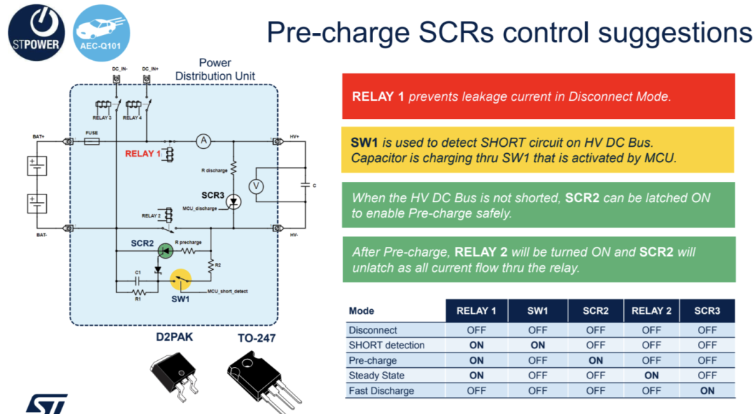 在预充电方面,SCR 同样发挥关键作用。传统的预充电继电器多为机电式接触器,存在切换速度慢、易磨损、寿命有限及产生电磁干扰(EMI)等问题。ST 采用的 SCR 作为固态开关替代方案,可有效解决这些弊端。