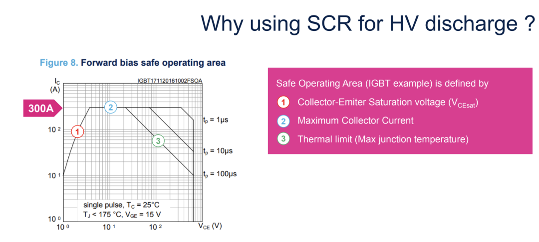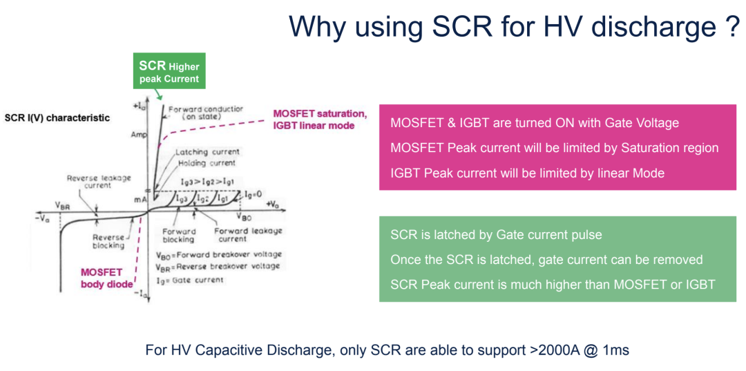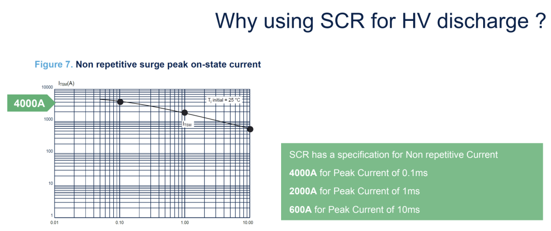 ● 快速响应能力:SCR可以在毫秒级内完成放电,相比传统的IGBT或MOSFET,其峰值电流能力更高(可达4000A),满足高电压平台下的快速放电需求。