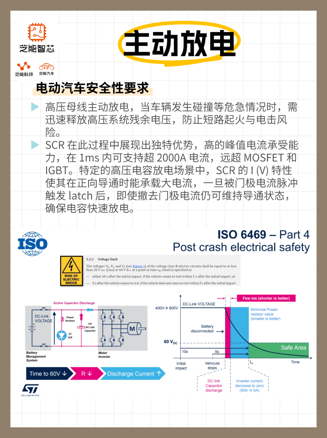 主动放电技术在EV高压母线中起到关键的安全保障作用,核心需求在于快速将电容残留电压降至安全水平(如ISO 6469规定的60V以下),以防止因电气短路或事故引发火灾及电击。