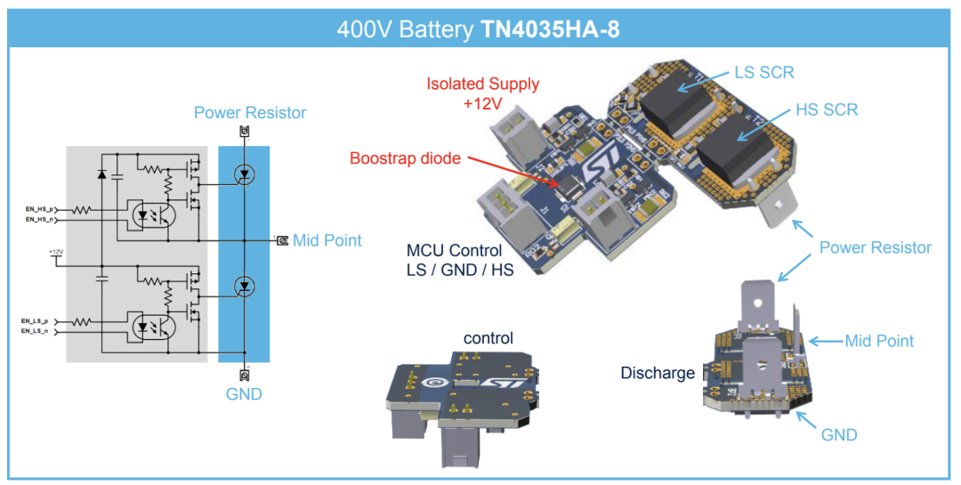 ST通过设计高峰值电流能力和短关断时间的SCR,支持客户优化预充电电阻值,进一步缩短预充电时间。这种灵活性为客户提供了显著的设计自由度。主动放电和预充电技术广泛应用于EV的电池管理系统(BMS)和高压配电单元(PDU)。