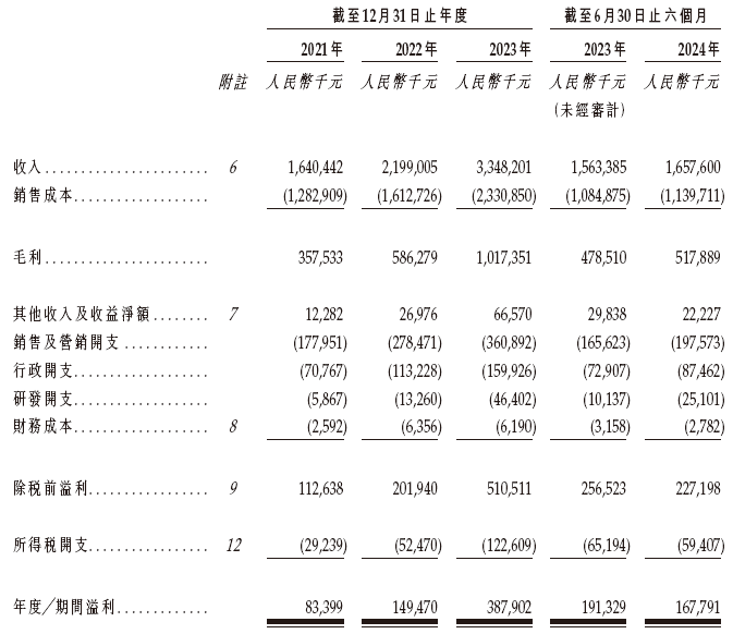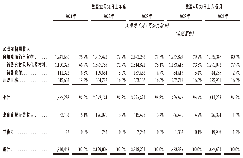 招股书显示,在过去的2021年、2022年、2023年和2024年上半年,沪上阿姨的营业收入分别为人民币16.40亿、21.99亿、33.48亿和16.58亿元,相应的净利润分别为人民币0.83亿、1.49亿、3.88亿和1.68亿元。