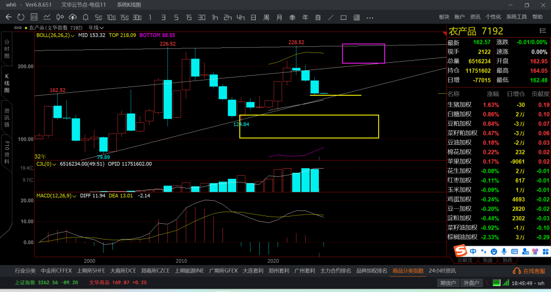 农产品指数下方底部是130-100,最次是160布局,上方是200-230附近,这个算不明显,但如果看豆粕类就非常明显了。