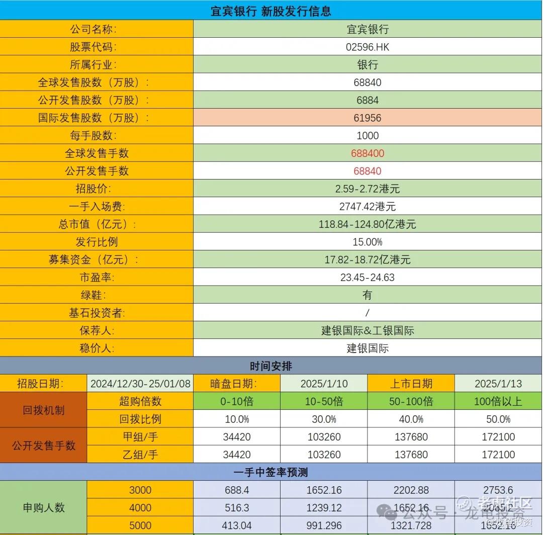 宜宾银行是四川省宜宾市的一家城商银行,主要收入来源于利息,港股内银股总共上市30只,市盈率基本都在8倍内,PE8倍以上的4只银行股基本没有成交量,等于是四只死股,没有意义,另外还有几只港股城商银行,哪怕是合理PE,依然无成交量,进入死股行列。而宜宾银行发行市值118.84-124.80亿港元,市盈率23.45-24.63倍,要么市值来两次腰斩,进入合理市值,要么业绩翻两翻,显然后者不太可能;还有一种可能是保持一个虚值,很快变成一只死股。