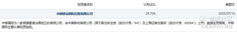 基石投资者只有1家,中国移动认购占比29.70%。