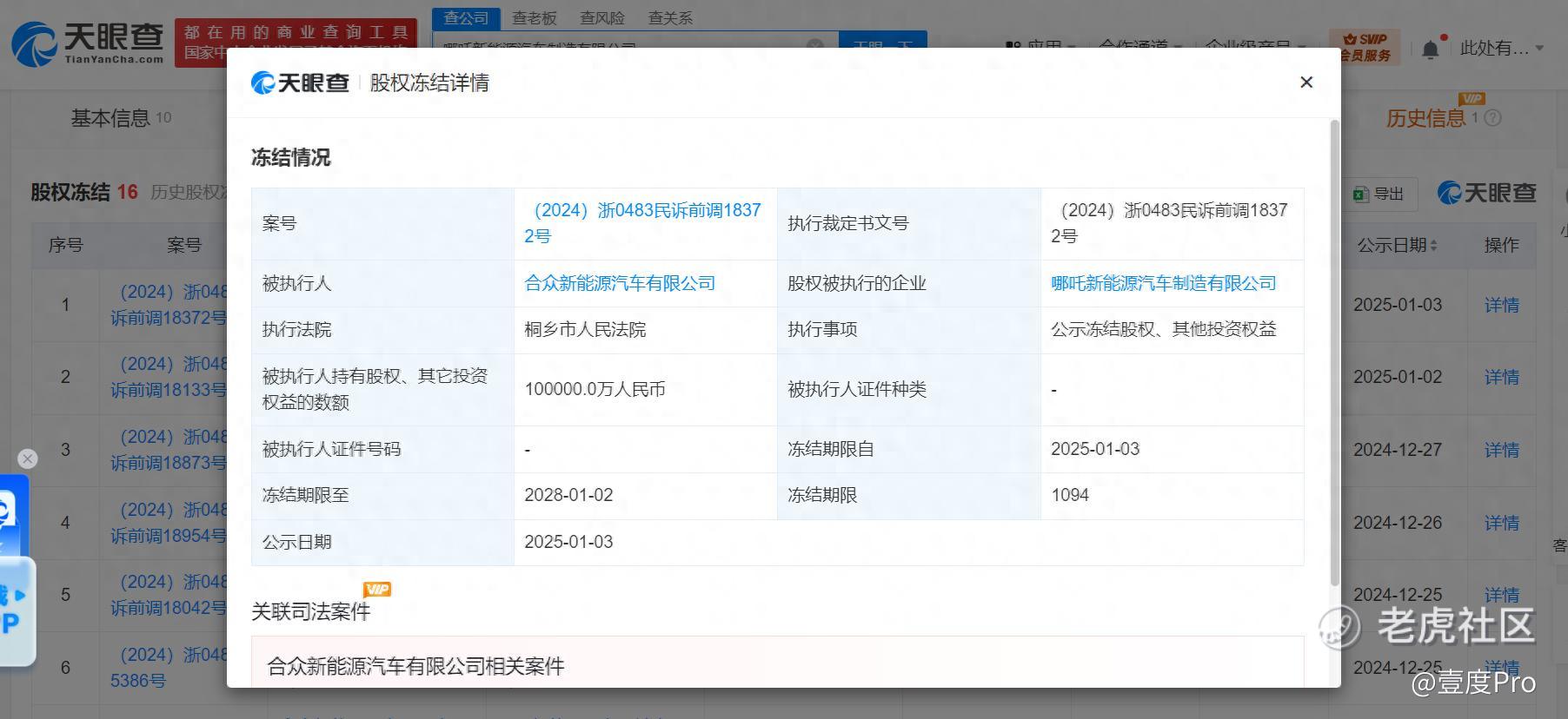 值得注意的是,天眼风险信息显示,合众新能源汽车有限公司现存多条股权冻结信息。近日,该公司新增一条股权冻结信息,股权被执行的企业为哪吒新能源汽车制造有限公司,冻结股权数额10亿人民币,冻结期限自2025年1月3日至2028年1月2日,执行法院为浙江省嘉兴市桐乡市人民法院。此外,该公司还现存1条被执行人信息,执行金额超911万。