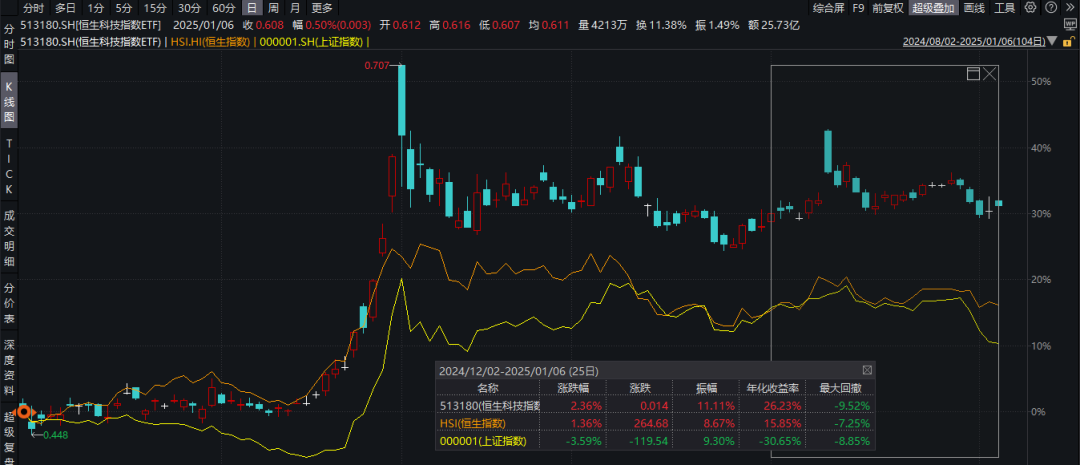 二是24年9月底至10月初,在9月底连续的政策出台后,恒生科技指数15个交易日内涨超50%。在短时间内极为陡峭的斜率上涨,市场开始回调进入震荡行情延续至今。从目前恒生科技指数的位置来看,处于大涨后9月底的位置,也就是恒生指数20000点的附近。