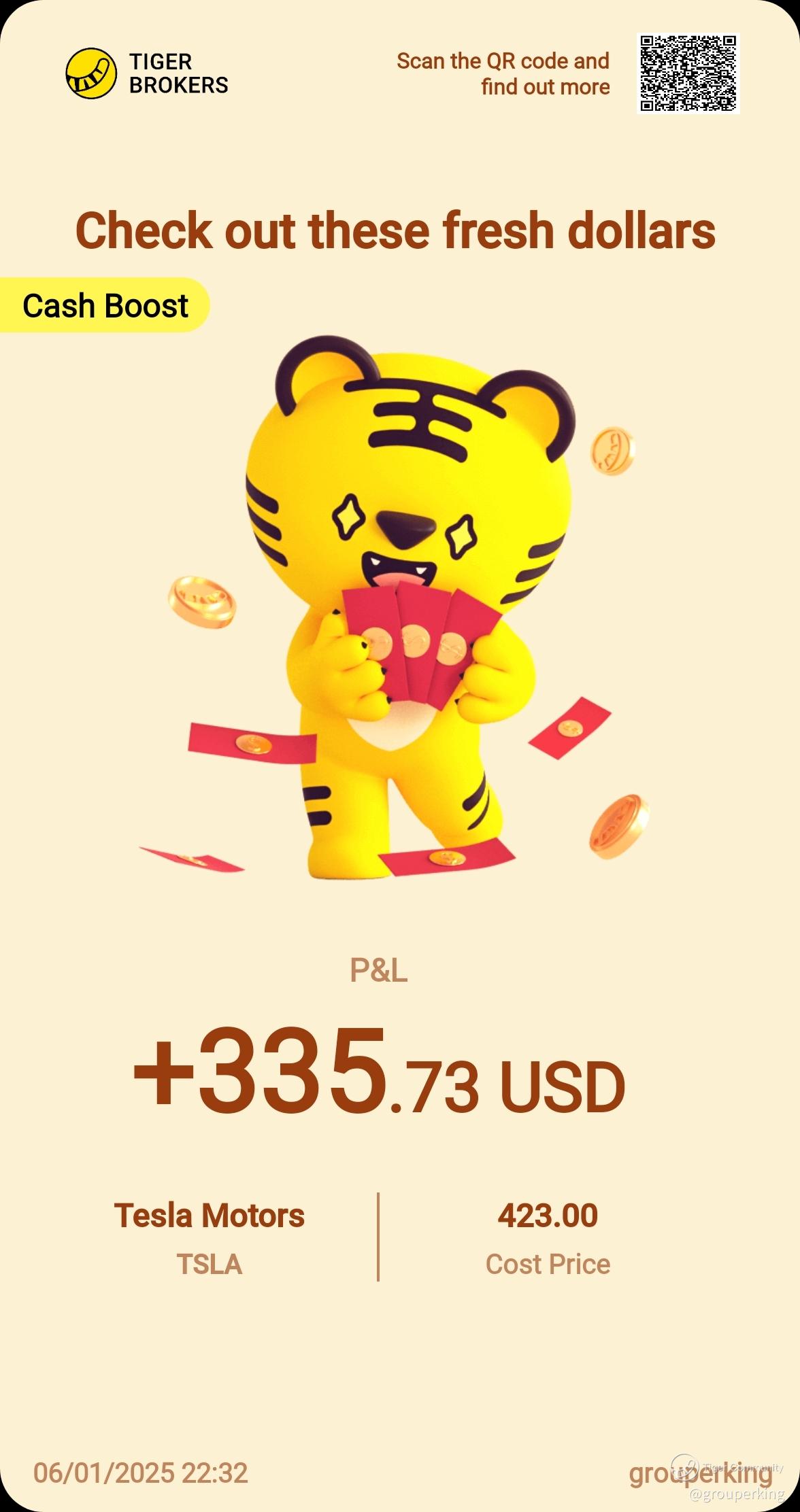 $Tesla Motors(TSLA)$ My first small profit using my "itchy hand account" . Thank you Cash boost account