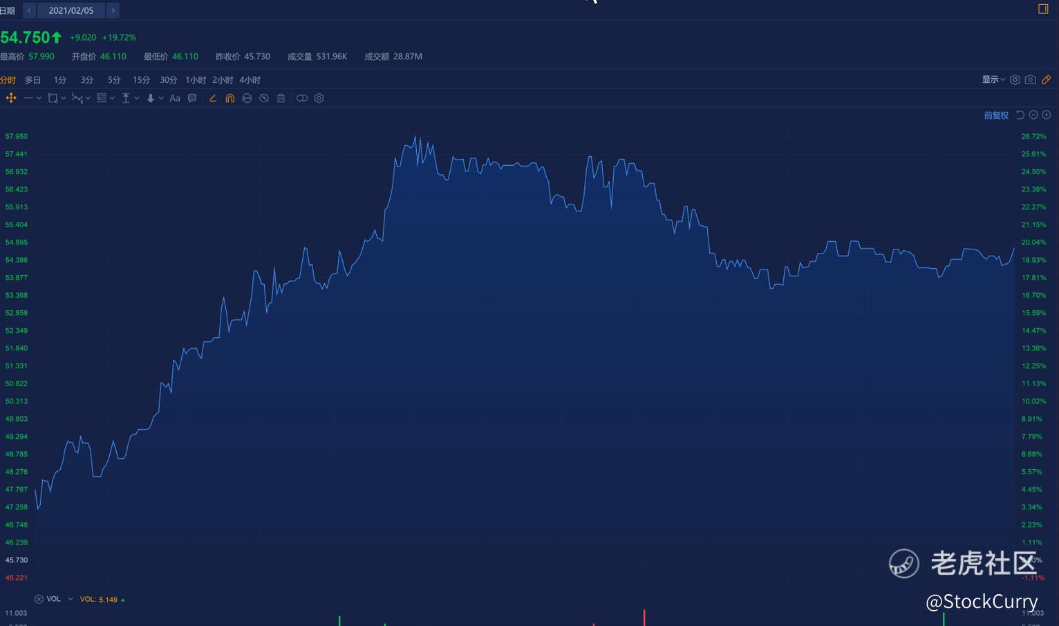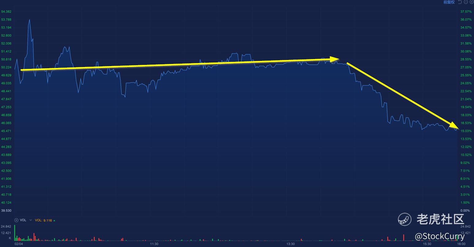 结果财报一出果然大涨,第二天开盘涨了 27%。 全天基本维持在 25% 以上,但是下午 2:20 以后突然跳水,最后只收涨 16%。
