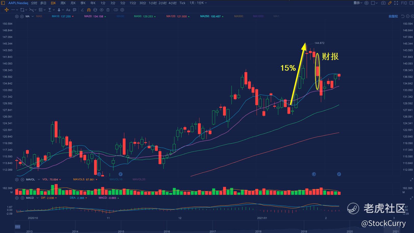 最近苹果的财报可以说是好到爆棚,可是财报后还跌了 3%,从财报前一周的走势我们可以看到在财报前的一周时间苹果从 126 一直涨到了 144, 涨了近 15%。所以财报下跌也不足为奇。而且当时很多机构都看好苹果的财报,也算是 buy the rumor sell the news 吧。
