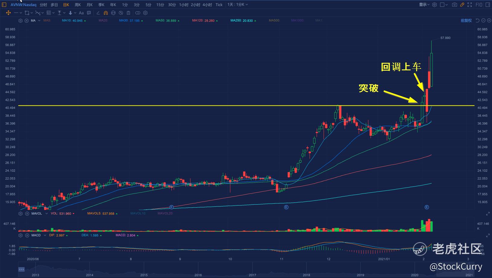 $阿维亚网络公司(AVNW.US)$这支股票我们是在 2/1 日股价突破前高的时候发现的,并在 2/2 第一时间买进了,图形像教科书一样标准,突破,回调,下面就等着涨就可以了。