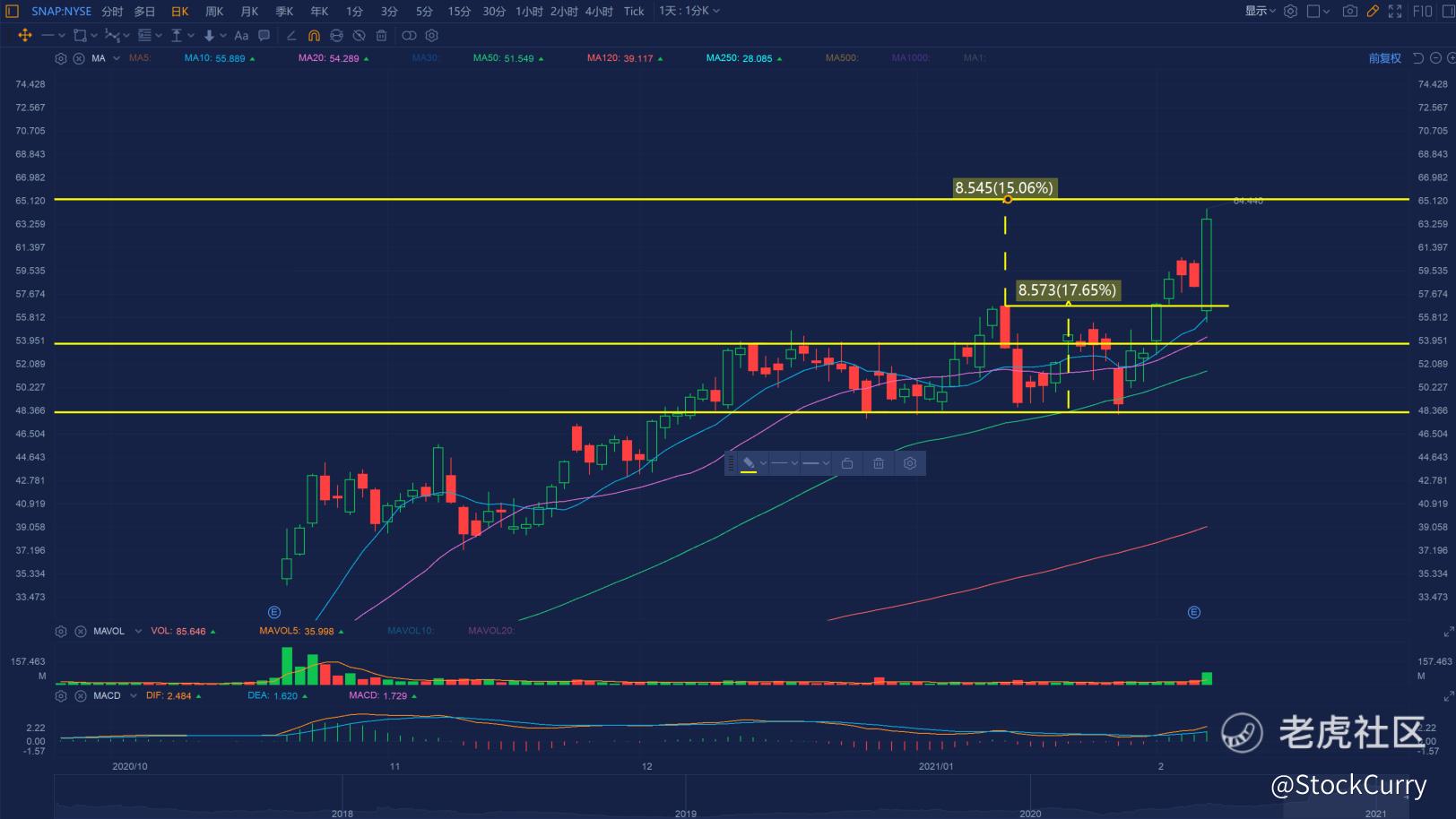 例如,周五的 SNAP, 盘后财报出来以后股价跌了 7% 左右,但是开盘以后股价确只跌了 2%,之后便一路向上,最后收盘大涨 9%。