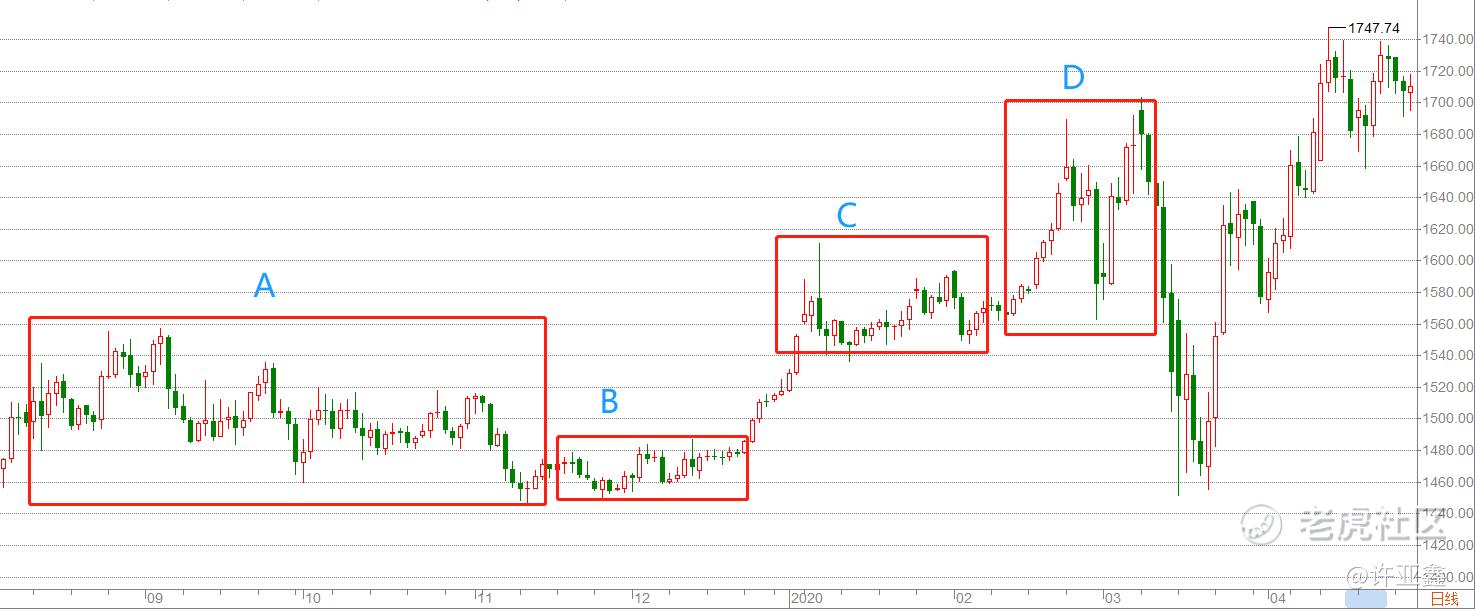 笔者截取了2019年四季度至2020年季度的黄金行情为例,图上分别列有A、B、C、D四个交易机会,A段中黄金在最后完成冲高后展开回落,其实当时我们是不可能知道黄金下跌的低点会出现在哪里,也不知道后面黄金会继续上涨,更多的是判断这里会出现顶部,但是顶部究竟要通过什么方式调整结束,尚未可知,当然最终是通过时间换空间的方式完成,不过黄金在震荡两个月后,我们已经能够从图上看出要完成的是教科书式的下降三角,这个时候我们可以有两种选择,一种是通过高杠杆工具进行高抛低吸,另一种是通过无杠杆工具进行单边低多或者单边高空,无论选择哪一种风险都是可控。