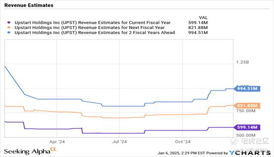 人工智能借贷平台预计到2024年底,收入将以7.2亿美元的运行率增长。共识分析师预测Upstart在2025年将达到8.22亿美元的销售额。