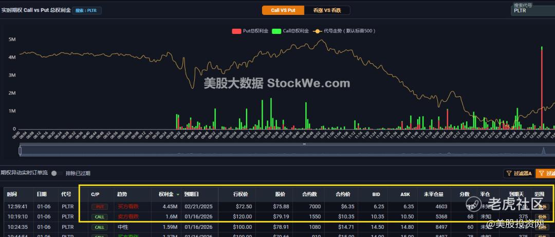 此外就在前天,根据美股大数据StockWe.com扫描PLTR巨量444万美元看跌期权大单,而DAL出现689万美元巨量看涨大单