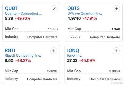 在这一背景下,量子计算概念股遭遇大幅下跌。QUBT跌幅超过49%,RGTI下跌48%,QMCO暴跌30%,IONQ和QBTS分别下跌45%和48%。
