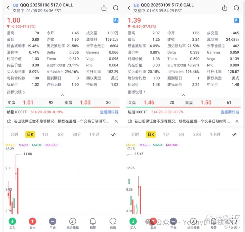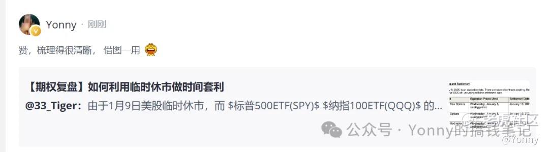 我们都知道1月9日美股是休市,且这是一次突发的休市通知(美国前总统卡特2024年12月29日逝世)。而期权链是早就定好的,我们发现几个美股大盘ETF的期权链上,显示1月9日的期权仍然是能够正常交易的,而且1月9日同样价位的期权,都比1月8日的要贵——这原本是一个正常的现象,但因为1月9日是休市,这个时候套利空间就产生了——1月9日的期权会加速到1月8日到期,都会同样以1月8日大盘的收盘价作为结算价,理论上这两个交易日的期权应该接近于同样的价格交易,实际上却没有。