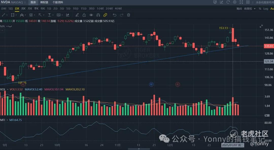 在CES大会后,英伟达居然高开低走,走出了一根通常只在大A出现的墓碑线…… 这往往不是一个很好的信号。果然后两天的follow through就说明了它的弱势,又继续跌了3%。但整体上,达子还是在上升趋势线上方的。如果下周跟随大盘一起企稳,叠加指标如果进入了超卖区间 又从超卖区间走出,那可能又是一个短线入场的信号了。
