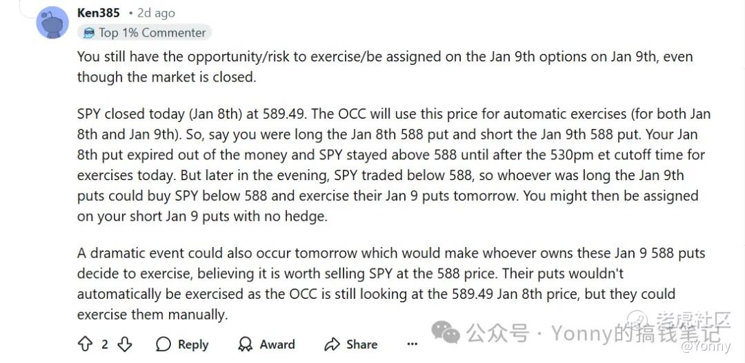 假设你卖了一单SPY 588的日历价差,而1月8日收盘在了589,你1月8日的买权作废了。但是呢,美东时间1月8日 5:30 PM 后,突然发生了一件类似911或者WW3级别的超级大事件,虽然市场已经休市了,没有行情展示,但作为1月9日的put 买方他们肯定是要行权的,因为说不定1月10日开盘的时候,SPY都要跌到500去了… 同时你这个1月8日的BUY PUT就失去了对冲的效果。