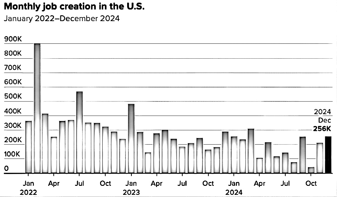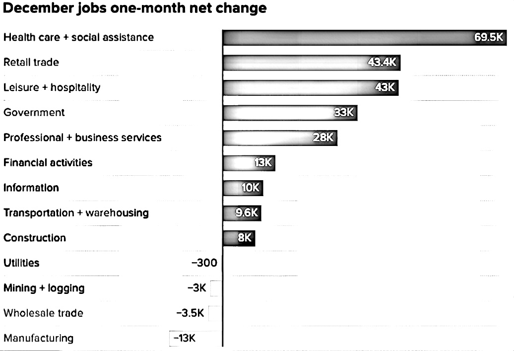 ③此外从薪资增长来看,12月薪资环比+0.3%,全年涨幅下降至3.9%。如果到了1月份就业人数下降,加上这样的薪资水平持续下降的趋势有助于降低通膨的顽固性,则会刺激联储重新开始考虑降息。
