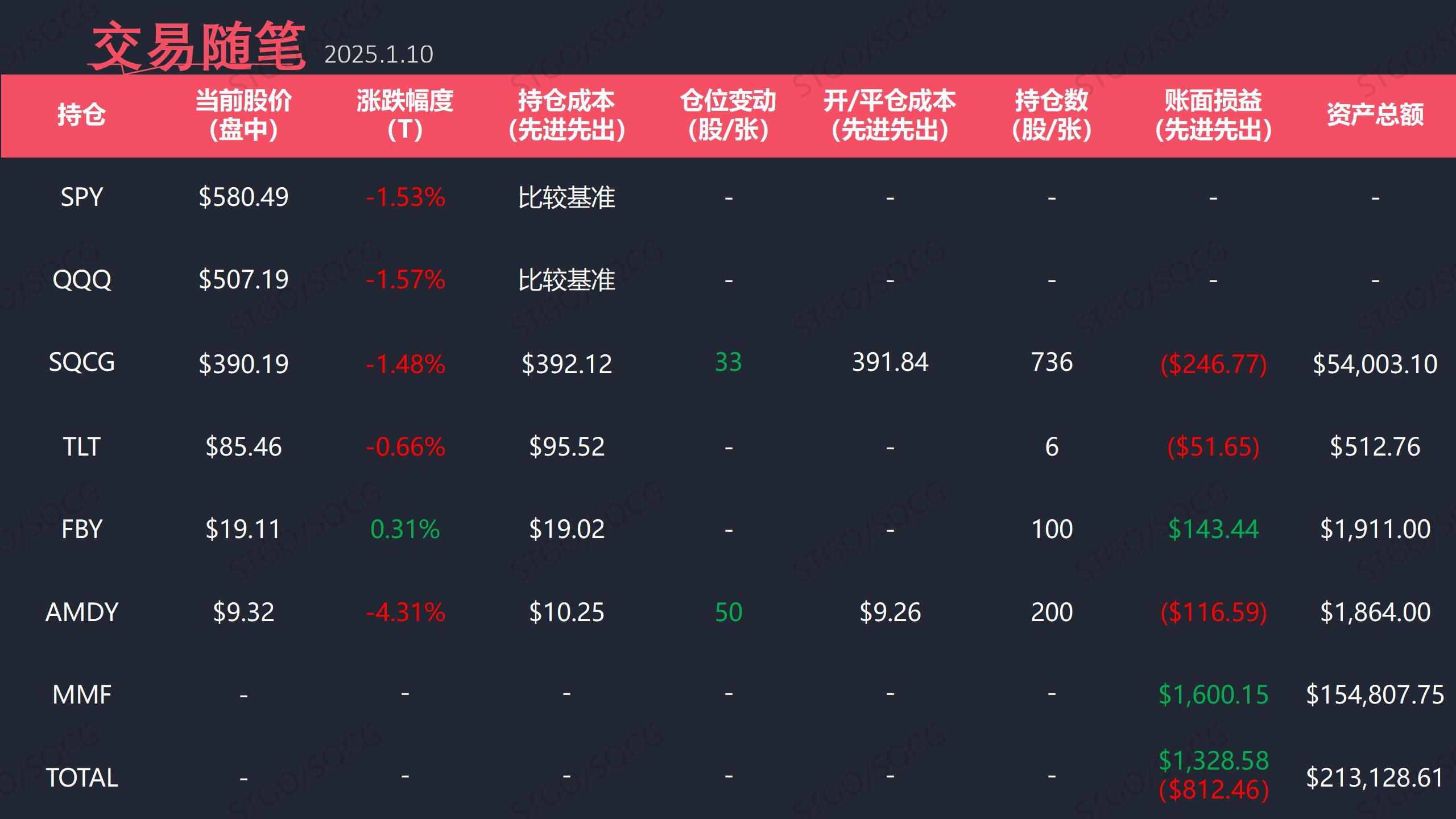2、大盘在盘中跌破关键位置时出现强烈抵抗,这个位置和我们1月7号给出的加仓点位基本一致,行为上看似乎还是想守住11.6以来Trump获选的缺口,收盘也差不多在这个位置。但是接下去15日通膨数据、20日Trump上任、29日议息会议,市场会以宽幅震荡的方式Price in各种事件,这个点位是否成功防守,要看月底之后的结果。SQCG与大盘基本持平,其实只要SQCG和大盘不相上下,我们相对于市场中的一般投资者就舒服很多,毕竟我们有稳定股息,保证基本生活和红利再投。同时也还有一半的仓位用于保证成长性。操作方面: