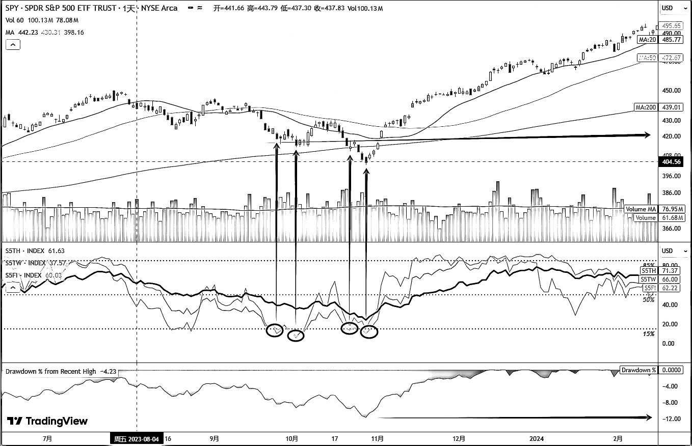 3、“鳄指”三线拐头向下,20线跌破20%,50线来到20%区间,200线跌破50%,开始进入衰弱区间。到此,我们要开始引起注意,因为我们的BTD信号3就来自于“鳄指”,其中20/50线要同时低于15%,而200线要跌破50%。