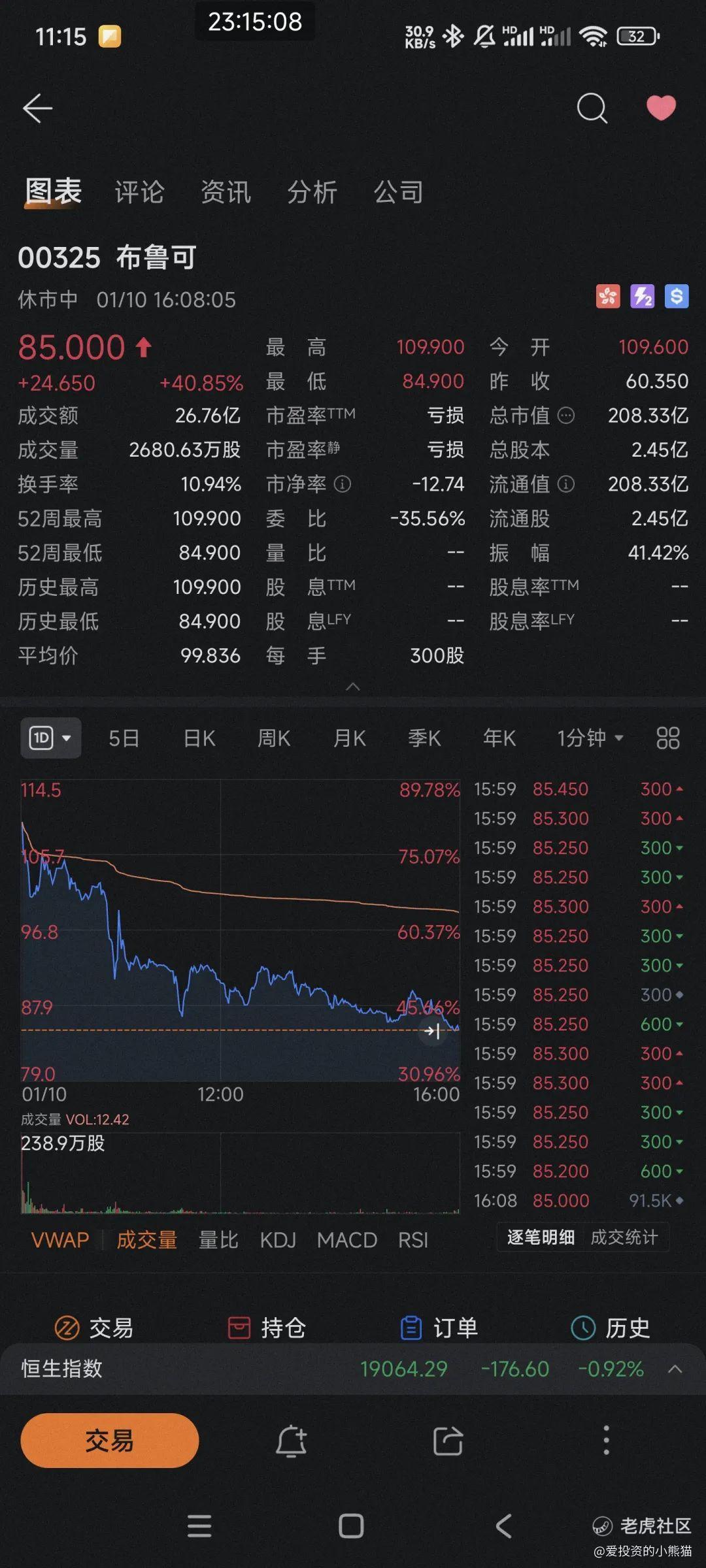 果然最后布鲁可就是和泡泡玛特一样来了个高开低走,截止到尾盘,以最低点收盘,现在想想,还是觉得打新中签的是最好的,要是炒新的裤衩都亏没了,早上开盘没卖的人也心里也都1万个不甘心。