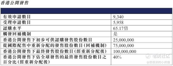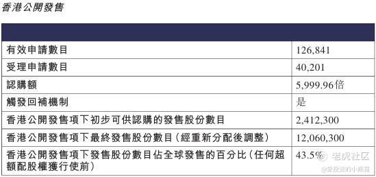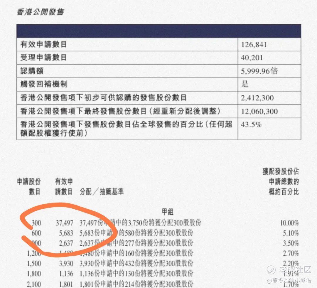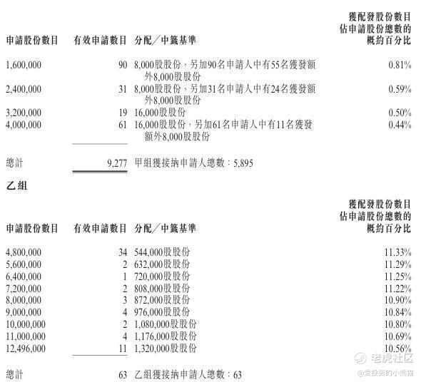 布鲁可(00325.HK)招股最终定价60.35港元,在招股价55.65港元-60.35港元的上限价,14.56亿港元的募资,147.91亿港元的总市值,发行比例9.99%。配售情况:126841人认购,这次公配5999.96倍,由于超过100倍,回拨比率43.50%(按理说是50.00%),也套路回拨了,国配有38.60倍,一手中签率10.00%,认购4020手才必中1手,同时乙组28120人申购,其中顶头槌申购5454张,获配率0.02%-0.16%!除了顶头槌以外,全体抽签。