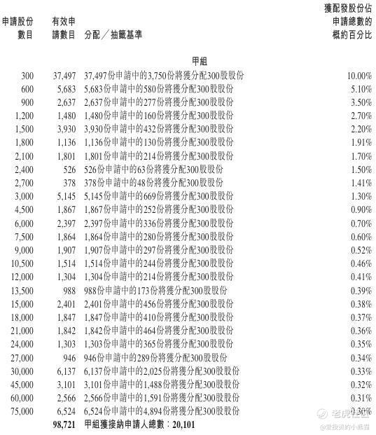 布鲁可(00325.HK)的乙组官方披露的中签名单里有14646人中签300股,有5454人顶头槌认购中签300股。乙组总共中签603万股,货值约3.64亿港元。